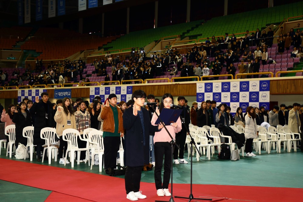 - At 11:00 a.m. on February 26, the 2019 Daejin University Entrance Ceremony was held in the indoor gymnasium. On this day, 1,920 people in total including Yun Eundo, the chair of Daejin University Educational Foundation, Lee Myeon-jae, the dean of Daejin University, and other related people including executive members of the educational foundation, school faculty, external personnel, and parents attended the ceremony to welcome new students. The students included 15 students from the College of Daesoon Theology, 410 from the College of Liberal Arts, 320 from the College of Global Trade and Industry, 340 from the College of Public Service, 360 from the College of Science and Technology, and 475 from the College of Human IT Engineering. The entrance ceremony began with the opening address and continued with events such as a report on matters concerning education, the declaration of entrance admissions, an oath by the representative of the freshmen, and a welcoming address. - Lee Myeonjae, the dean of Daejin University, said in his welcoming address “Our university is fully prepared to enable students to become talented people who can adapt themselves to the fast-changing world and promote the betterment of others.” He added “Do not limit yourselves only to one field or major in your studies, but approach various fields with creative and integrated ways of thinking to go beyond Korea and apply your talents throughout the world in your work. In response, the representative of freshmen, Im Jun-hyeong, said in his oath that they will take upon themselves the foundational spirit of Daejin University: Sincerity, Respectfulness, and Faithfulness. He vowed that they would become the proud Daejinians and contribute to the prosperity of the nation and people of Korea.