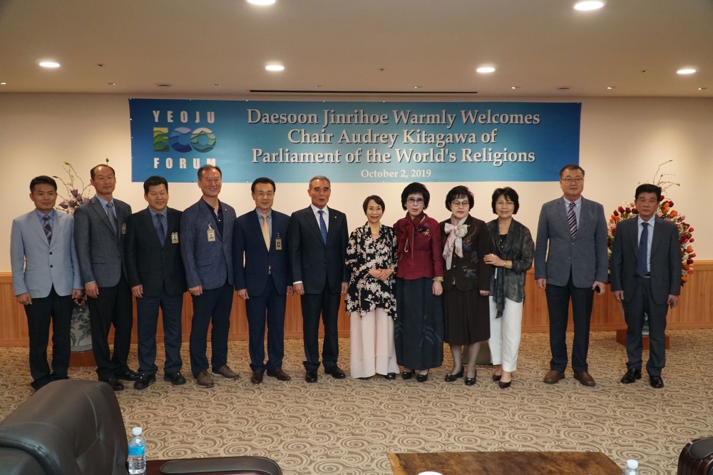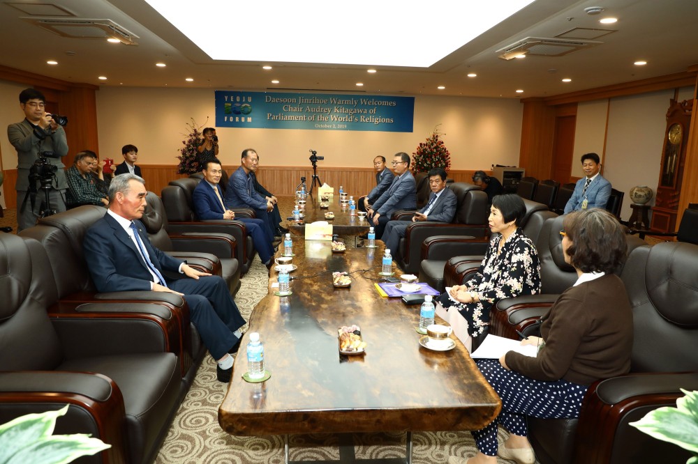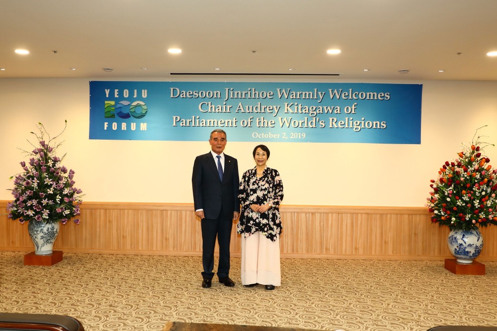 - On October 2, 2019, Audrey Kitagawa, the Chair of the Board of Trustees of the PoWR, visited Daesoon Jinrihoe Yeoju Headquarters Temple Complex prior to the opening of the 2019 Yeoju Eco-Forum. Previously, she served as an Advisor to the Office of the Special Representative of the Secretary General for Children and Armed Conflict at the United Nations. Currently, she is the Chair of the UN Task Force and the Programmatic Areas Standing Committee of the PoWR. During her meeting with President Yun Eun-Do, Audrey Kitagawa said that it was the first time for her to engage in an exchange with religious groups in Asia although she hasactively interacted with many while in Europe, Australia, and the USA. She said “Through this forum, I hope that many resources owned by various religions of the east and the west can be used for the harmony and peace of the world.” She also said “I wish each of the religions go beyond their own ideologies and form a discourse on the solution for ecological crisis and the realization of world peace.” In his response, President Yun Eun-Do said “We are already trying to practice the idea of Sangsaeng, and I will positively consider expanding interfaith dialogue on harmony and Sangsaeng.”Meanwhile, the PoWR acts as a trans-religious organization that connects religions to social groups and provides ethical and universal principles to facilitate cooperation among many different groups of people. Also, the PoWR carries out various activities in close collaboration with institutions related to UN’s projects on Environmentalism or World Hunger.