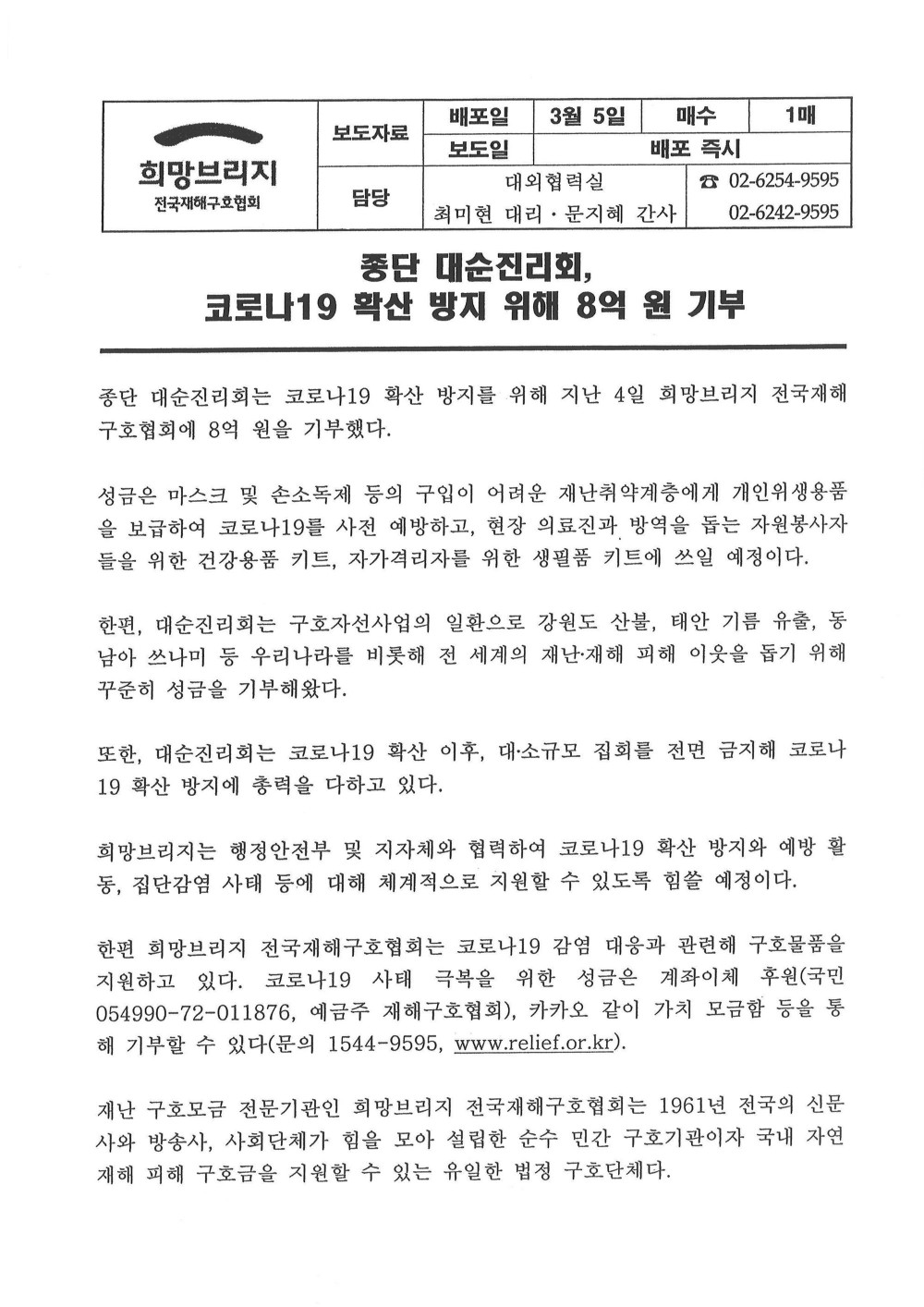 - Daesoon Jinrihoe donated 800 million won to "Hope Bridge National Disaster Relief Association" on March 4th to aid in preventing the spread of COVID-19 (Coronavirus disease 2019). Among these funds, 400 million won was allotted to preventative measures enacted at Daesoon Jinrihoe's Yeoju Headquarters Temple Complex.