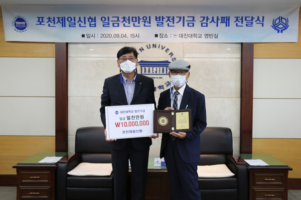 - Daejin University delivered a plaque of appreciation to Pocheon First Credit Union Chairman, Jeong Hee-Jin, in a guest room on the second floor of the main building at 3 pm on Friday, September 4th. The plaque was presented in honor of the chairman’s generous donation of 10 million won in development funds to the university. Chairman Jeong Hee-Jin has made many donations and participated in many volunteer activities in the local community.
