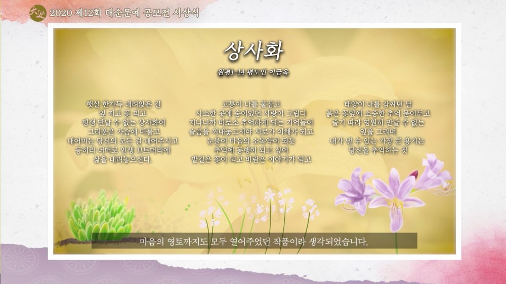 - On October 9th 2020, the 12th Daesoon Literature Contest Awards Ceremony was held as a video conference. - In his congratulatory remark, Tae-Yeol Lee, Director of the Religious Research & Edification Department, said, “Due to COVID-19, it was proposed that we not hold this event in person.” “If through Daesoon Literature you can convey your own experiences in a way that incorporates emotion and a strong will to practice, your writings will help spread Daesoon Truth.” - After the remarks, the winners were announced and reviews from panelists were likewise provided. A total of 83 works were submitted for this competition: 48 in the prose category and 35 in the verse category. Geumneung 5-8 Branch Temple’s Senior Propagator Kim Manshik's My Grandmother won 1st place in the verse category and Wonpyeong 2-22 Branch Temple Senior Propagator Hong Songjeong's Long Dream won 1st place in the verse category.
