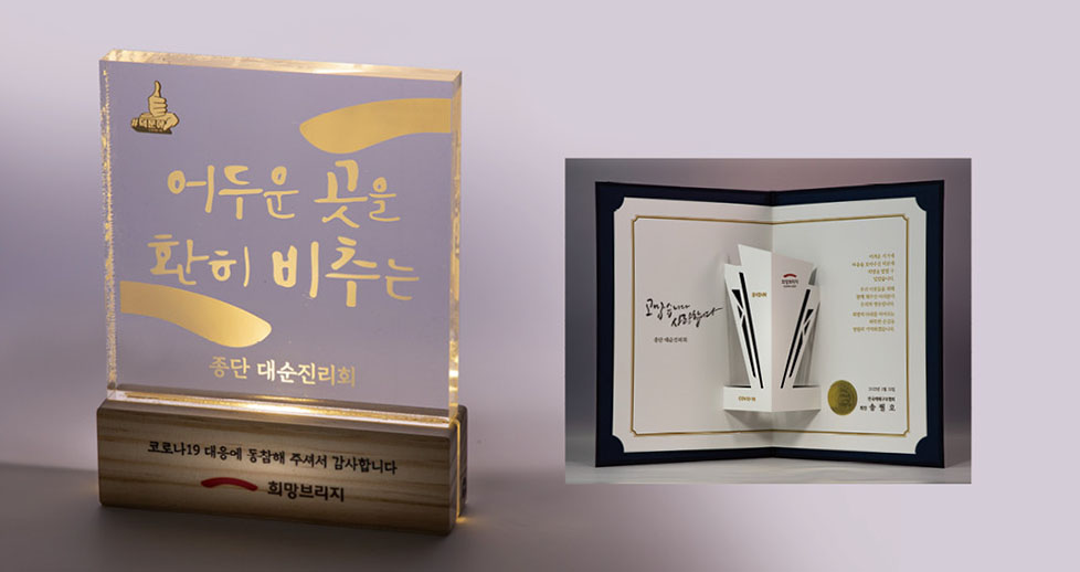 On January 31st, Hope Bridge, the Korea Disaster Relief Association delivered a letter of appreciation and a plaque of appreciation to Daesoon Jinrihoe. Last year, Daesoon Jinrihoe donated 800 million won (400 million won from the Yeoju Headquarters Temple Complex) towards preventing the spread of COVID-19.
