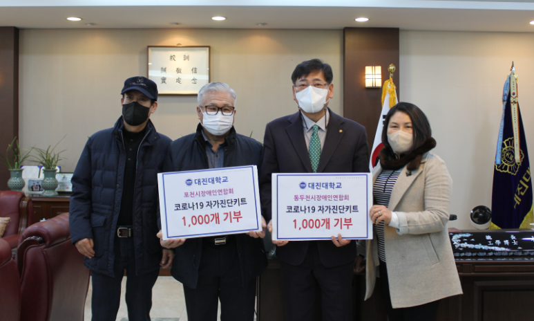 Daejin University distributed 1,000 self-diagnosis kits to the Pocheon and Dongducheon branches of the Disabled People's Association on January 6th. The site where the donations took place was the guest room on the 2nd floor of Daejin University’s main building. The kits will be used towards the prevention of additional COVID-19 infection in nearby areas through preemptive testing for early detection.