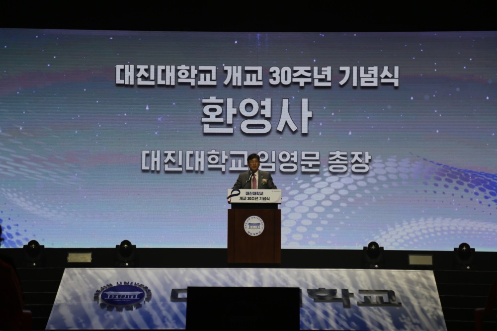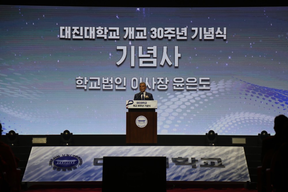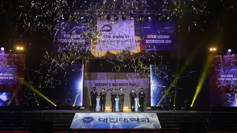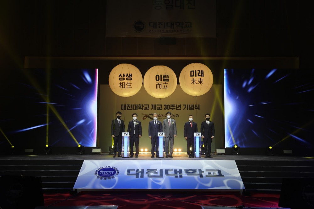 - Daejin University held a 30th Anniversary Ceremony at Daejin University Gymnasium at 2:00 PM on May 12th. The ceremony was attended by University Chairman Yoon Eun-Do and University President Leem Youngmoon. On that day, Daejin University celebrated the 30th anniversary of its founding and presented a vision as expressed via three keywords: 'Turning Thirty,' 'Mutual Beneficence,' and 'Future-oriented.' These keywords are meant to officially declare Daejin University’s goal to lay down a foundation for education, cooperate with the nation and society, and achieve the realization of a proud future society. - In a congratulatory speech, University Chairman Yoon Eun-Do remarked, “Daejin University, which is now celebrating its 30th anniversary, is growing into a prestigious private school through the hard work, blood, sweat, and tears of its faculty and staff who have contributed to the development of the university.” - In addition, University President Leem Youngmoon said, “I hope that you will reflect upon the will of the founder of our school and strengthen a new determination to apply to your respective position in order to aid in the development and advancement of our university.”