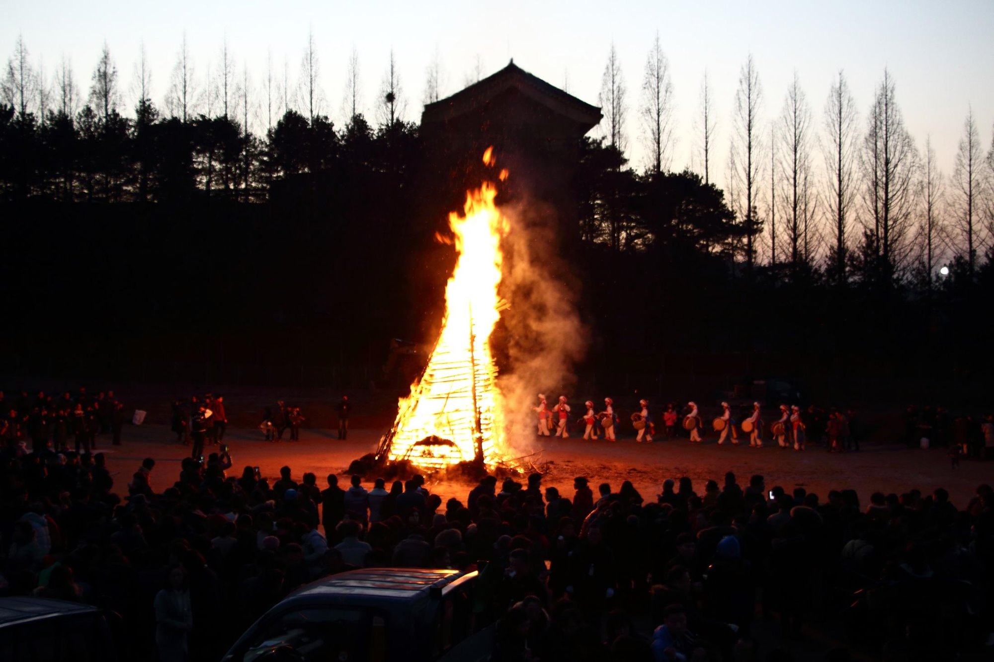 - Daesoon Jinrihoe held the annual sheaf burning event in Bamgol, which is located next to the grand sports field of Yeoju Headquarters Temple Complex. About 1,000 disciples and local residents participated in the event. Before the main event, they played traditional Korean folk games such as kite-flying, Korean badminton (jegichagi), arm wrestling, and a traditional Korean board game called “yutnori” and also made food-offerings such as fish cake soup (eomuk tang) and ear-quickening wine (served on the first full moon day of the lunar new year). Starting with a gilnori (road game) performance at 5:30 pm, Daesoon Hanmadang folk music team performed a pangut exorcism and jishin-babgi (stepping on the spirits of the terrain). - During the sheaf burning, which is the main event, the participants made wishes in their minds while walking around the burning sheaf. Just like last year’s event, magnificent fireworks embroidered the night sky of the first full moon with colorful flames. - One of the participants who lives in Gangcheon-myeon gave his impression of this event remarking, “Every year I join this event with other villagers. I am always thankful to Daesoon Jinrihoe for working hard for our community and providing cultural events like this one.”  .jpg1.jpg) .jpg) .jpg) .jpg)   .jpg)